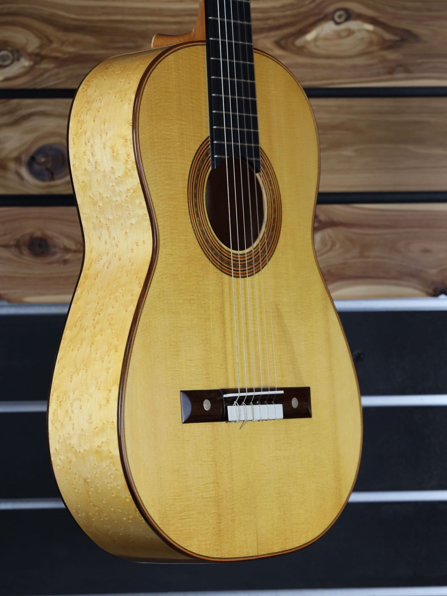 This one was actually built by Altamira’s Hanson Yao with beautiful birdseye maple and a hand rubbed finish it’s very lightweight construction gives this guitar a crisp tone with powerful projection.