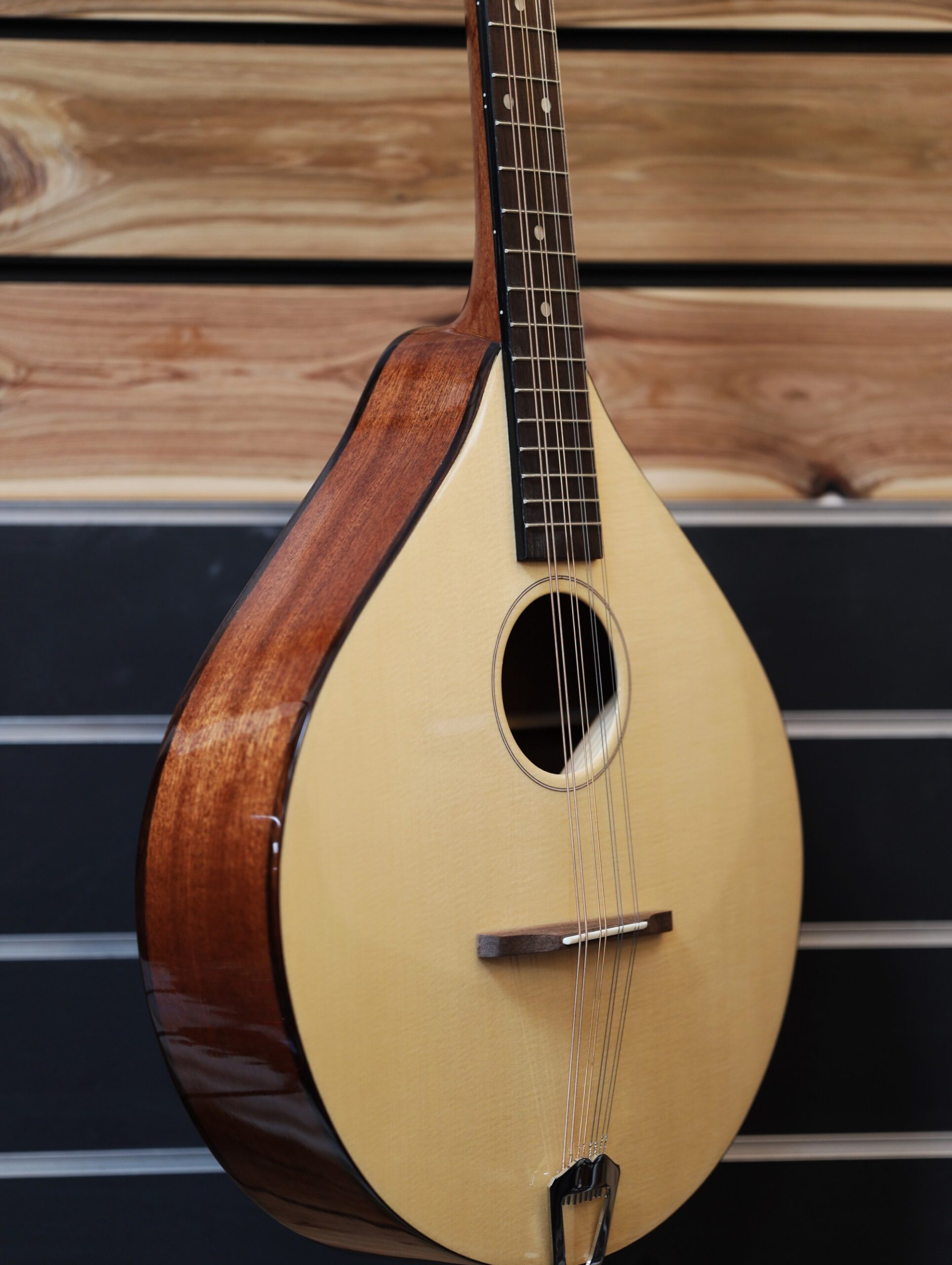 The Style E Ashbury Irish Bouzouki represents the higher level in the Ashbury range. With a fine spruce solid top and choice solid Sapele body. The top is carved so the tone is brighter than some of the flat top bouzoukis around. The standard tuning is in fifths G-D-A-E low to high but sometimes the high E can be lowered to D.