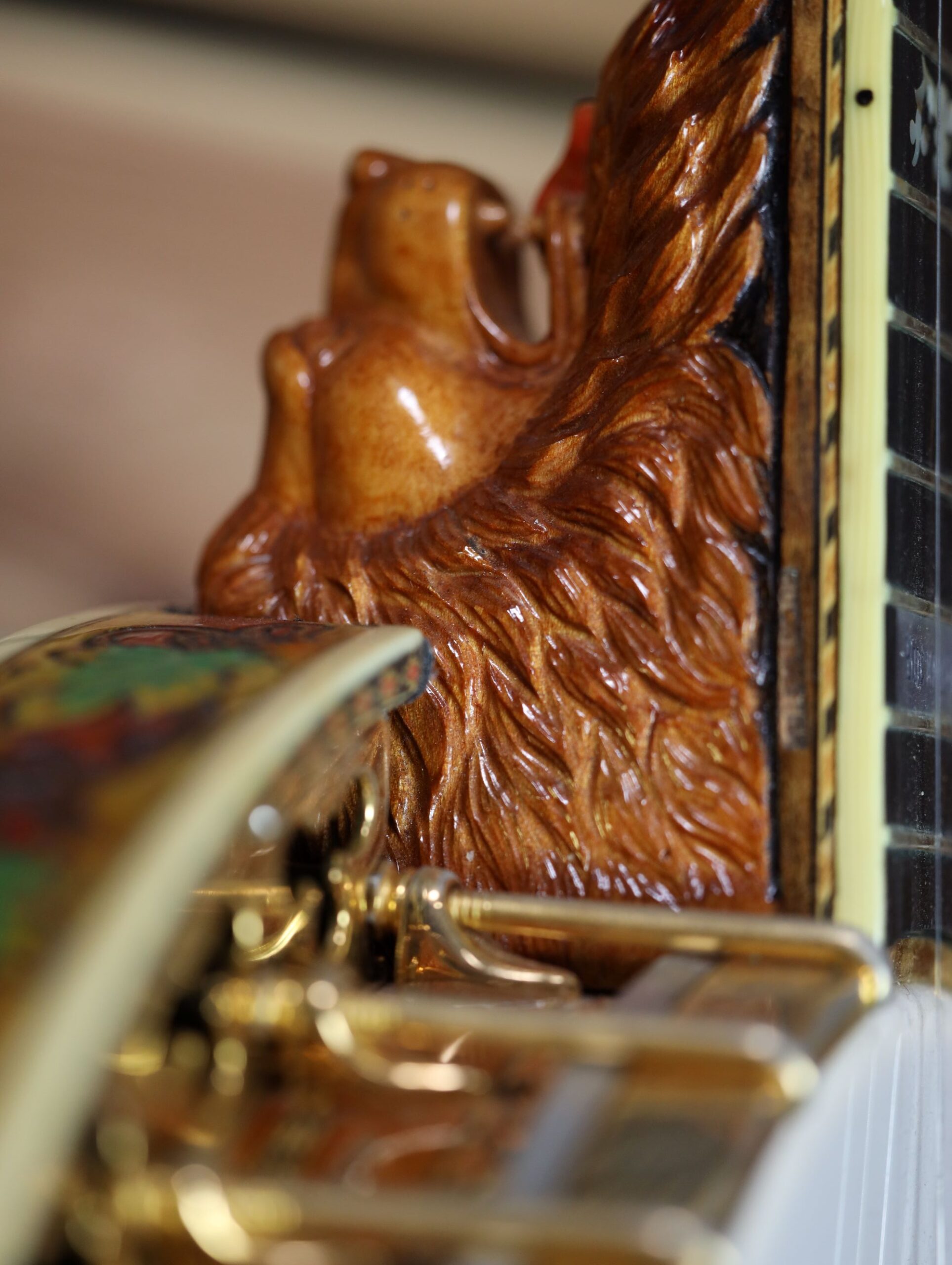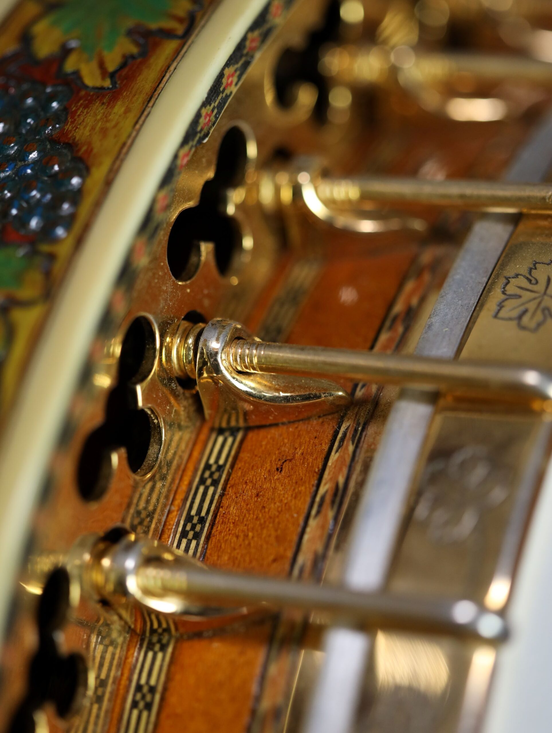 Roger Buckmaster’s work on this instruments is pretty mind blowing. Whatever his hourly rate was back then would never have covered the time he would have spent building this instrument. Building banjos, even plain instruments is a time consuming business but the “Buckmaster Special #2 ” goes way beyond that. A labour of love would best describe his work here. The Special #2 sounds just like it looks because it is one of the loudest banjo I have ever had in my shop so it does comes with a warning if you live in an apartment. It is loud but not harsh and has a bell like quality, crisp and clear with lots of sustaining tones.