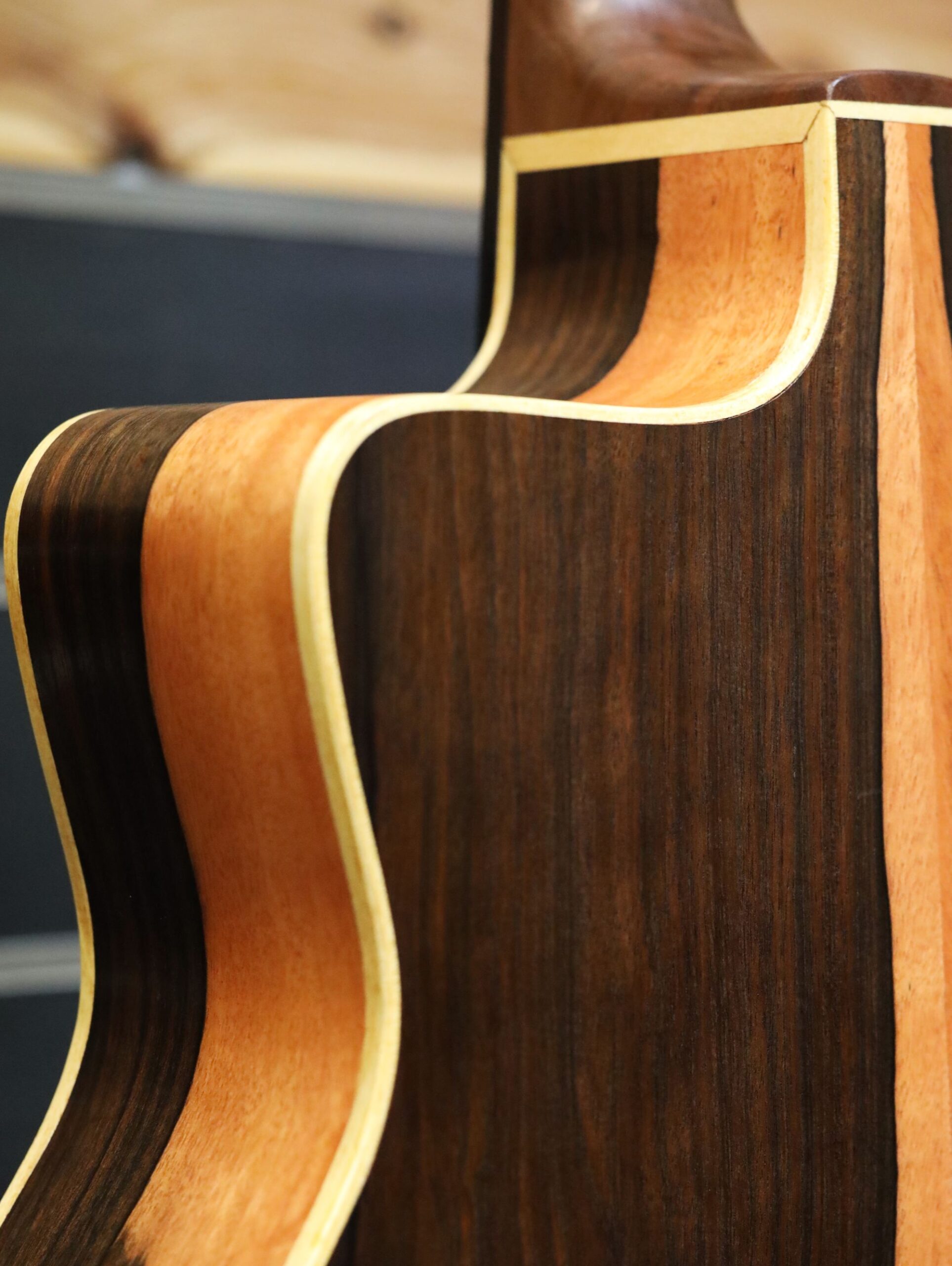Handmade by Geronimo Mateos in Madrid this guitar stands out in the shop and not only for it’s glorious Ziricote Sapwood back and sides. This Geronimo Mateos guitar put out a sound not heard before in my shop. The combinations a timbers used and the ever so light oil finish lets the guitar move air so easily. It has a warm lower tone that many GJ guitars do not have and maybe that is why the player like it. They are an acquired taste and compared to other types of guitars can sound loud but maybe a little harsh sometimes.