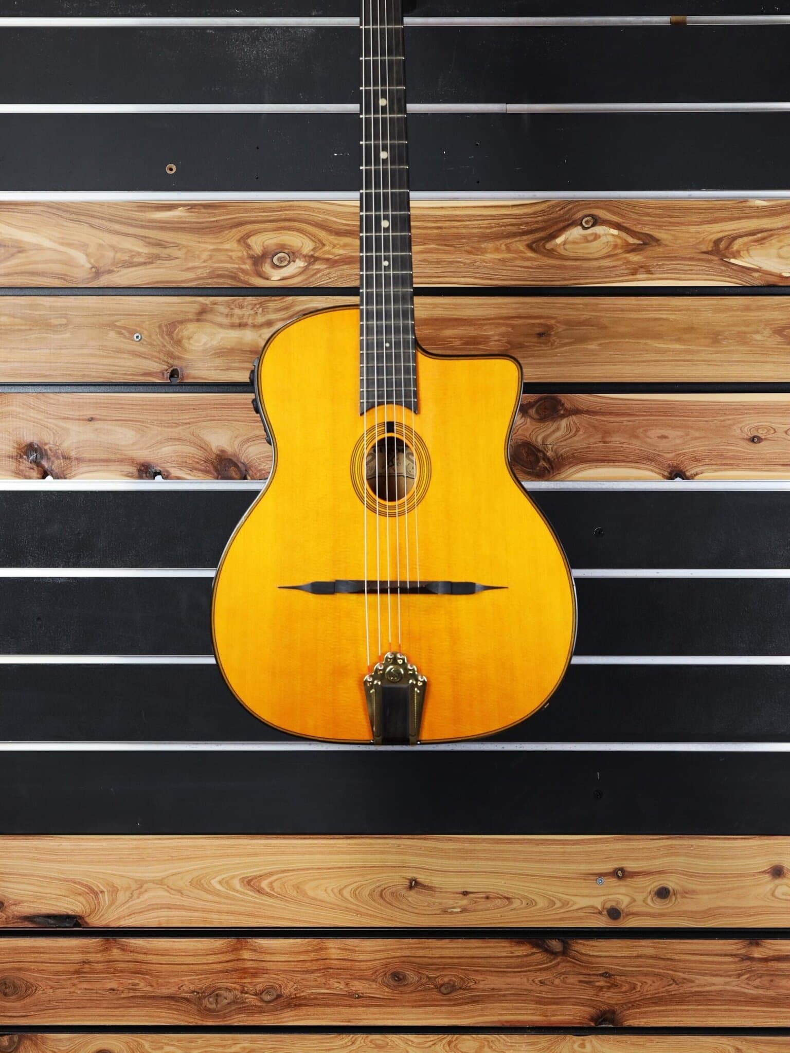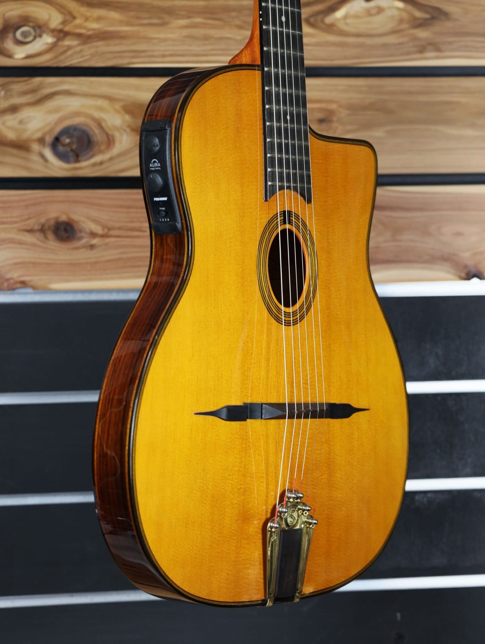 A thin body electro-acoustic gypsy jazz guitar with Fishman Aura pick-up system.