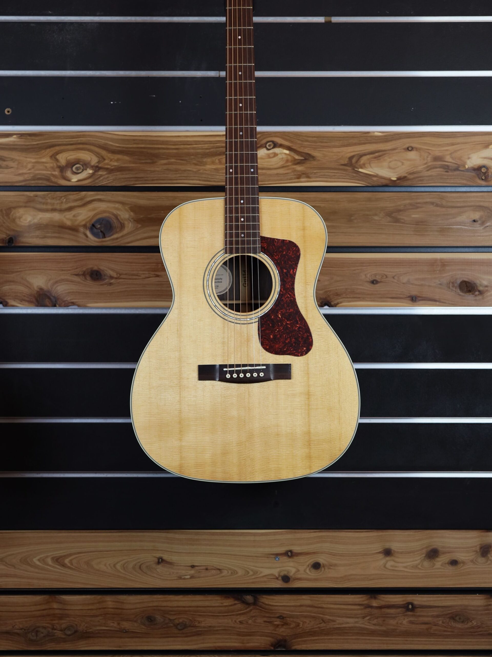 This mid-sized orchestra model acoustic is equally suited for strumming and fingerpicking it produces a sweet, balanced tone. A good choice for the versatile musician, the OM-150 features a solid Sitka spruce top and solid rosewood back and sides. Other features include a rosewood fingerboard and bridge, bone nut and saddle, and mother-of-pearl rosette. This model also has a 1¾” nut width on a vintage shaped Guild neck and the classic Chesterfield headstock emblem of 1960s.